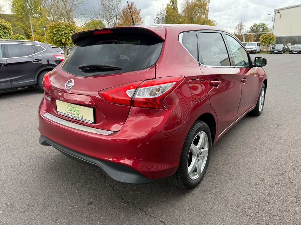3. Bremsleuchte, Airbag Beifahrerseite abschaltbar, Airbag Fahrer-/Beifahrerseite und Seitenairbag vorn, Audio-/Bordcomputerbedienung am Lenkrad, Ausstattungs-Paket: Nissan Connect, Automatische Fahrlichtschaltung, Außenspiegel elektr. verstellbar, Außenspiegel heizbar, Außenspiegel Wagenfarbe, Blinkleuchte in Außenspiegel integriert, Bordcomputer, Bremsassistent (Nissan Brake-Assist), Fahrassistenz-System: Autonomer Notbrems-Assistent, Fahrassistenz-System: Kurvenbremskontrolle (Aktive Spurkontrolle), Fahrer-Informations-System (FIS) mit Farbdisplay, Fensterheber elektrisch vorn + hinten, Fernentriegelung Tankklappe, Frontscheibe Verbundglas, Gepäckraumabdeckung / Rollo, Getränkehalter hinten, Getränkehalter vorn, Gurtstraffer, Handschuhfach beleuchtet, Heckscheibe heizbar, Innenspiegel mit Abblendautomatik, Isofix-Aufnahmen für Kindersitz, Karosserie: 5-türig, Kindersicherung, Klimaautomatik 2-Zonen, Kopf-Airbag-System, Kopfstützen vorn und hinten verstellbar, Lendenwirbelstütze Sitz vorn links und rechts, Lenksäule (Lenkrad) höhen-/längsverstellbar, Leseleuchte vorn, LM-Felgen, Luftdüsen hinten, Mittelarmlehne hinten, Mittelarmlehne vorn verschiebbar, Motor 1,2 Ltr. - 85 kW 16V KAT, Nebelschlussleuchte, Reifen-Reparaturset, Reifendruck-Kontrollsystem, Rücksitz geteilt/klappbar, Schadstoffarm nach Abgasnorm Euro 6, Schalt-/Wählhebelgriff Leder, Schaltpunktanzeige, Scheibenwischer mit Intervallschaltung, Sitz vorn links höhenverstellbar, Sitz vorn rechts höhenverstellbar, Sitzbezug / Polsterung: Teilleder, Sonnenblenden mit Spiegel, Start/Stop-Anlage, Steckdose (12V-Anschluß) in Mittelkonsole, Türgriffe innen verchromt, Verglasung hinten abgedunkelt, Wärmeschutzverglasung mit UV-Schutz